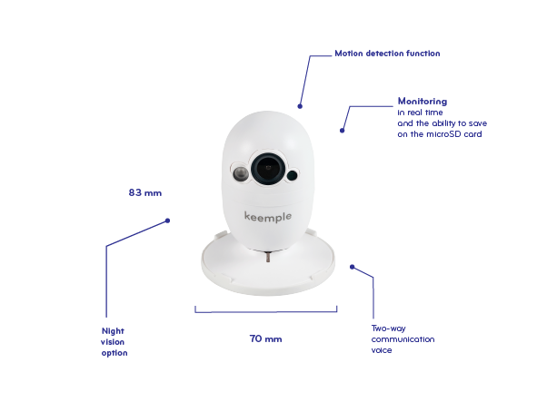 The Keemple smart camera is a monitoring device that allows users to observe their home in real time. The free Keemple 2.0 app installed on your mobile device allows you to monitor your home at any time. Modern technology, combined with Wi-Fi, allows the user to monitor the selected space. The camera has the option of saving recordings on a microSD card. The product is equipped with a good-quality microphone and loudspeaker and allows you to talk to your household members at any time. In addition, the Keemple camera has a motion detection function. Therefore, when it is added to the Keemple 2.0 Application, it is possible to be notified of activity in our absence. Its small size and universal design allows it to be placed in many places, while remaining discreet.
