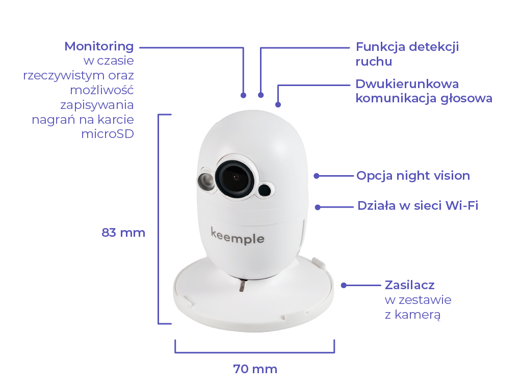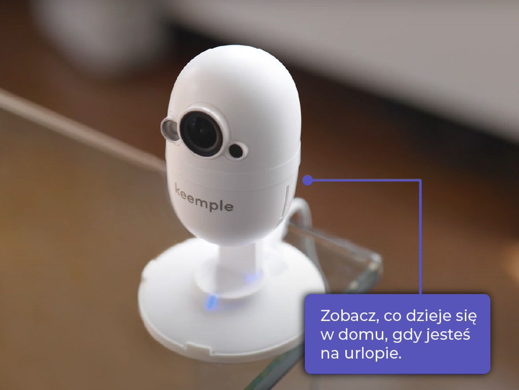 Kamera Keemple – kamera do monitoringu domowego z podglądem na żywo. To urządzenie przeznaczone do monitorowania wnętrz. Umożliwia podgląd w czasie rzeczywistym przez aplikację Keemple 2.0. Pozwala nagrywać wideo i zapisywać materiał do późniejszego odtworzenia na karcie microSD. Wyposażona jest w funkcję detekcji ruchu. Posiada również wbudowany mikrofon i głośnik, co pozwala na dwukierunkową komunikację głosową z osobami znajdującymi się w domu. Sprawdza się jako kamera do domu, mieszkania lub biura.