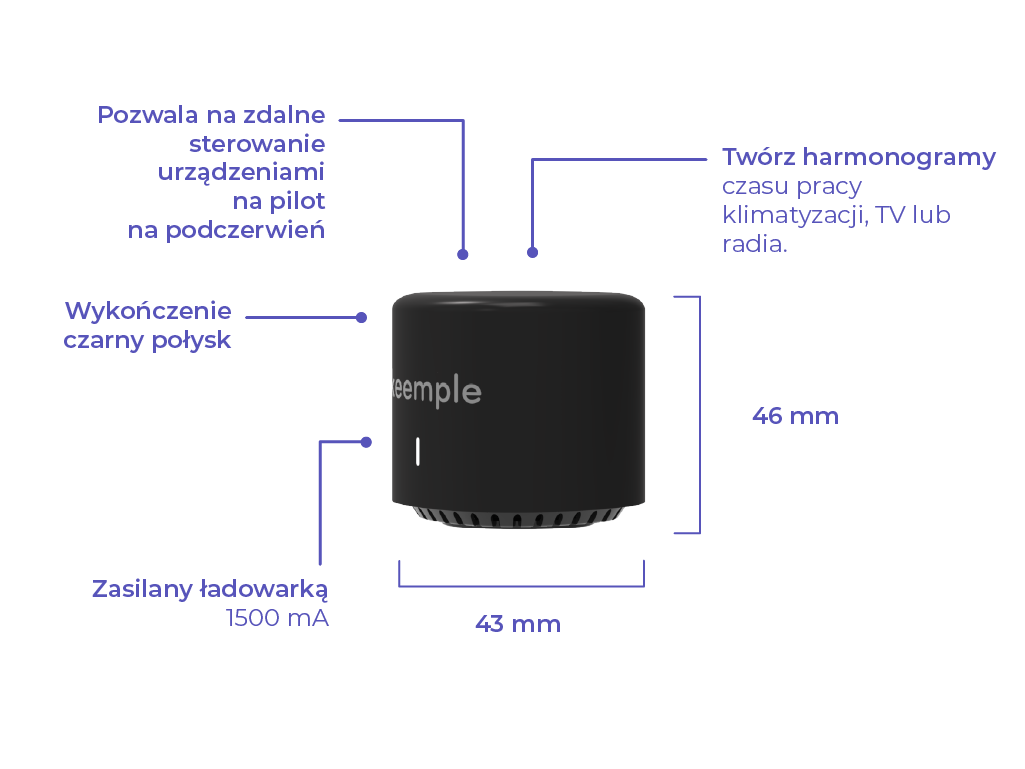 Niezawodny sterownik podczerwieni Keemple pełni wiele funkcji. Pozwala przede wszystkim sterować kompatybilnymi urządzeniami elektronicznymi, które są obsługiwane przez piloty na podczerwień, np. TV, klimatyzacją, czy odbiornikami Audio. Dzięki temu nie musimy szukać w mieszkaniu kilku różnych pilotów – wystarczy to urządzenie i darmowa aplikacja Keemple 2.0.